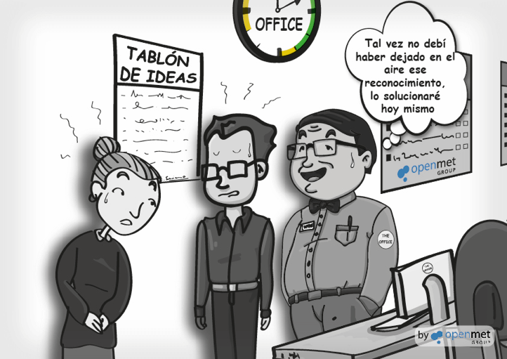 se aprecia a un jefe distinto que, observando una situación parecida a la anterior, se plantea la posibilidad de solucionar de inmediato este conflicto recordando su despiste al no reconocer la idea aportada en el Tablón de anuncios por ambos trabajadores. Los buenos líderes saben reconocer los esfuerzos, la iniciativa, las buenas ideas y los logros de su equipo de trabajo, y comparten con ellos más mensajes por el trabajo que se hace bien que por las equivocaciones u errores puntuales.